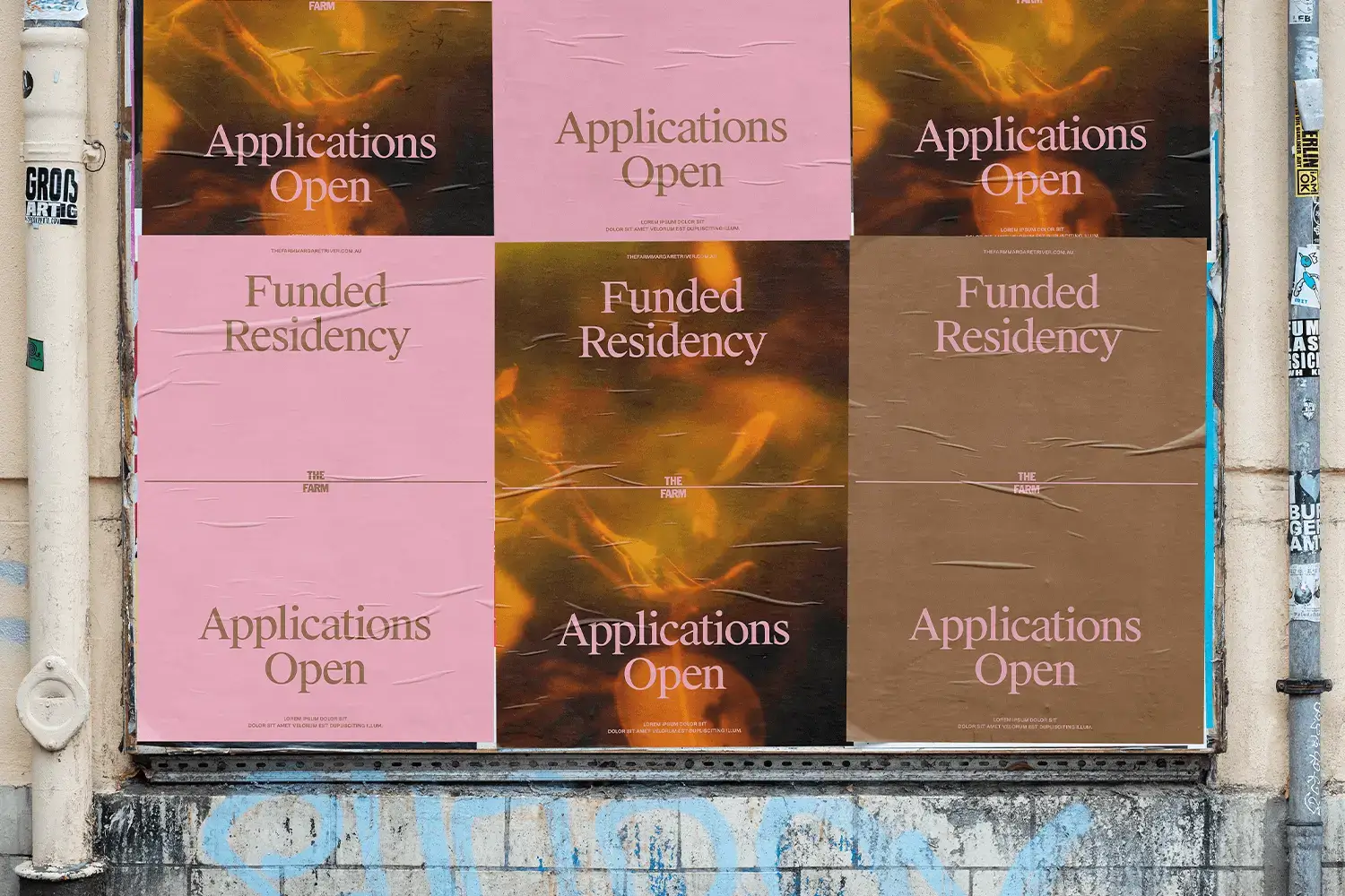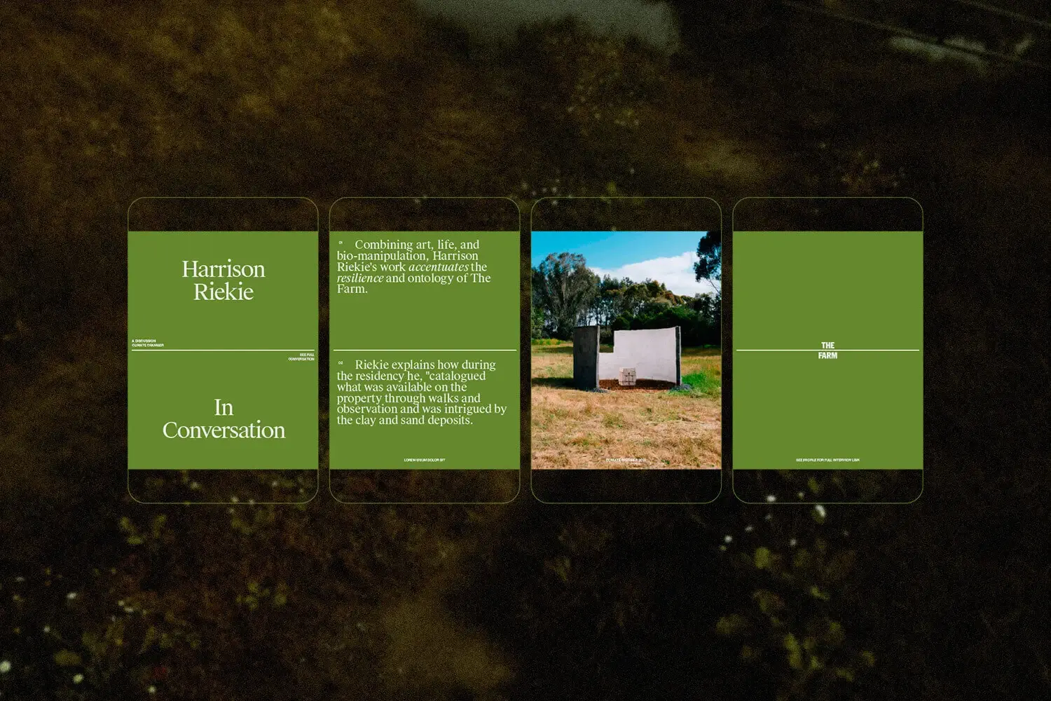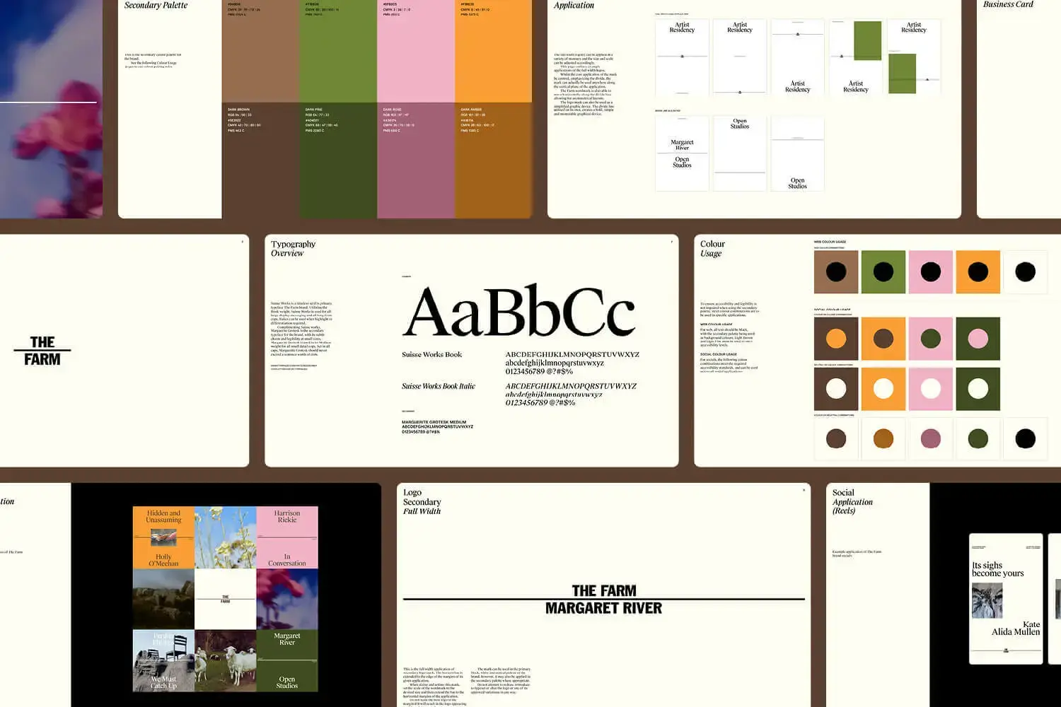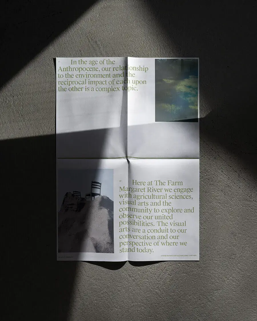 Working closely with Pretty-Soon® we built a brand identity rooted in the art institutes vision to create a deeper awareness and lasting appreciation of place and the natural environment, because humanity’s survival and continued growth fundamentally depends on it. The Farm seeks to bridge the divide between nature and culture through art, with that a system was built around a visual divider, ever present as a constant reminder of this goal. The extended identity drew from its Australiana heritage, using bold yet related type and colour.